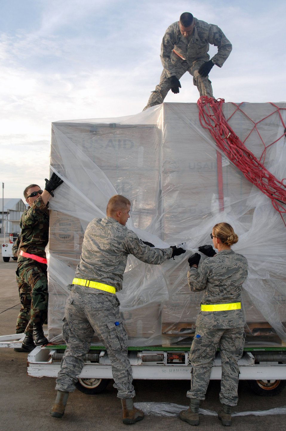 Airmen from Andersen Air Force Base, Guam, download humanitarian relief supplies from a Boeing 747 commercial airplane May 16 at Utapao Thai Royal Navy Air Base, Thailand, in preparation for delivery to Burma. Approximately 45 Airmen with the 36th Contingency Response Squadron forward deployed to provide aid and recovery assistance after Cyclone Nargis struck May 2.
