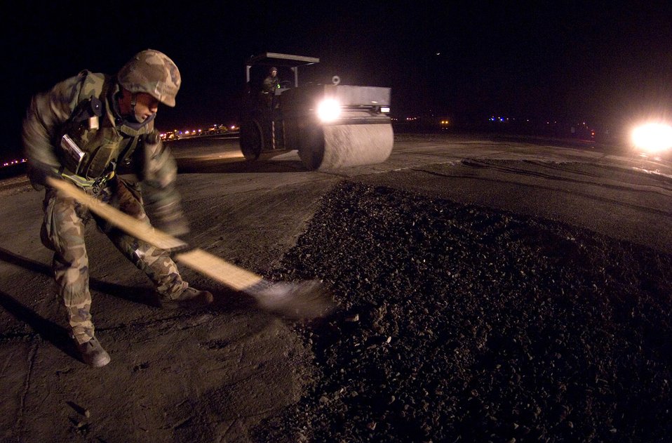 Staff Sgt Ephraim Advincula, an 8th Civil Engineer Squadron Airfield Damage Repair team member, shovels gravel into a crater being repaired on the runway April 19 at Kunsan Air Base, South Korea. Kunsan AB is currently undergoing an Operational Readiness Inspection to test the 8th Fighter Wing's ability to conduct its wartime mission. During exercises, ADR teams perform several functions including crater repair after simulated attacks and airfield lighting during simulated power outages, making it possible to get aircraft back in the air quickly.