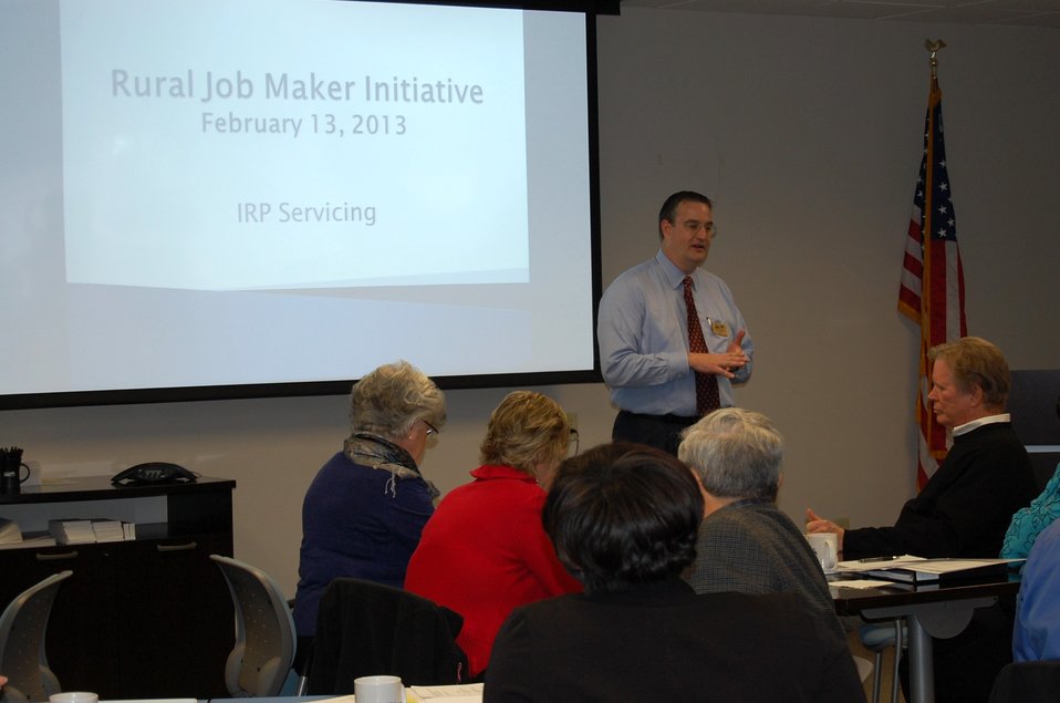 U.S. Department of Agriculture (USDA) Rural Development (RD) Business and Cooperative Program Director Bruce Pleasant facilitates the “Rural Job Maker Initiative Roundtable” held recently in Raleigh, NC with more than 35 community and business stakeholders and revolving loan providers on Feb. 12, 2013. USDA photo.